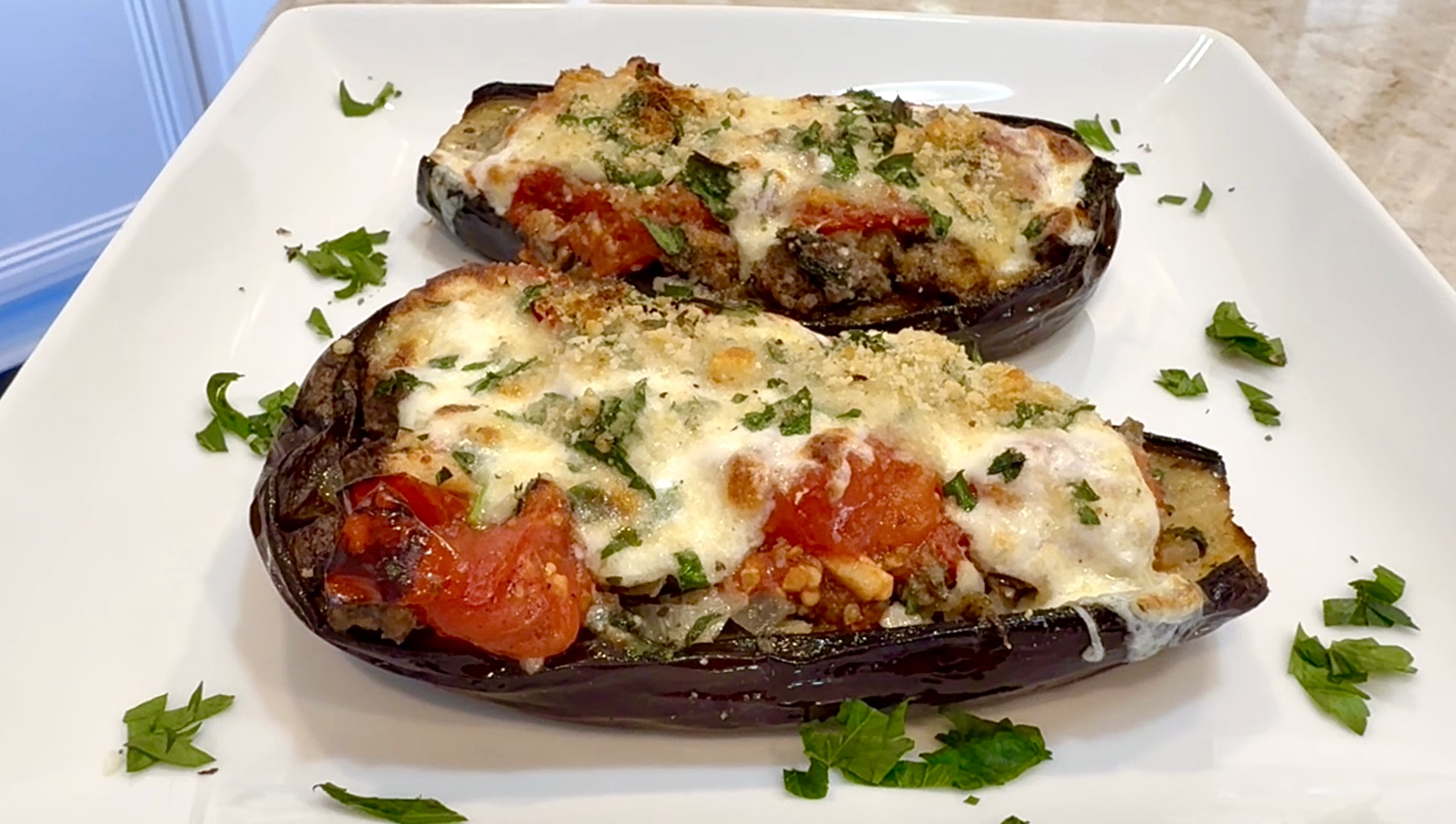 - Chop Italian Parsley, Garlic, Shallots, Tomatoes Place in frying pan olive oil, a little garlic and a little butter and sauté Then pour the chopped tomatoes and saute with a lid until cooked In another frying pan place ground beef and cook halfway then add in the chopped items garlic parsley shallots Italian seasoning and a little salt & pepper and stir until all is cooked. The Eggplant: Slice eggplant in half the long way Then score the eggplant cris crossed & spread on olive oil and salt & pepper Next place face down on baking pan covered with parchment paper And bake for 40 to 45 mins in the oven at 400 degrees. After it’s baked, turn over and press down on the eggplant meat until it’s shaped like a boat Then fill the boat with the seasoned ground beef some remaining juice from the cooked tomatoes Next add the tomatoes and the burrata cheese, sprinkling on the breadcrumbs and finally The Italian parsley. Place back into oven and bake for another 20 to 25 mins or so at 400 degrees Remove and enjoy! Please be careful the eggplant retains its heat for a long while.